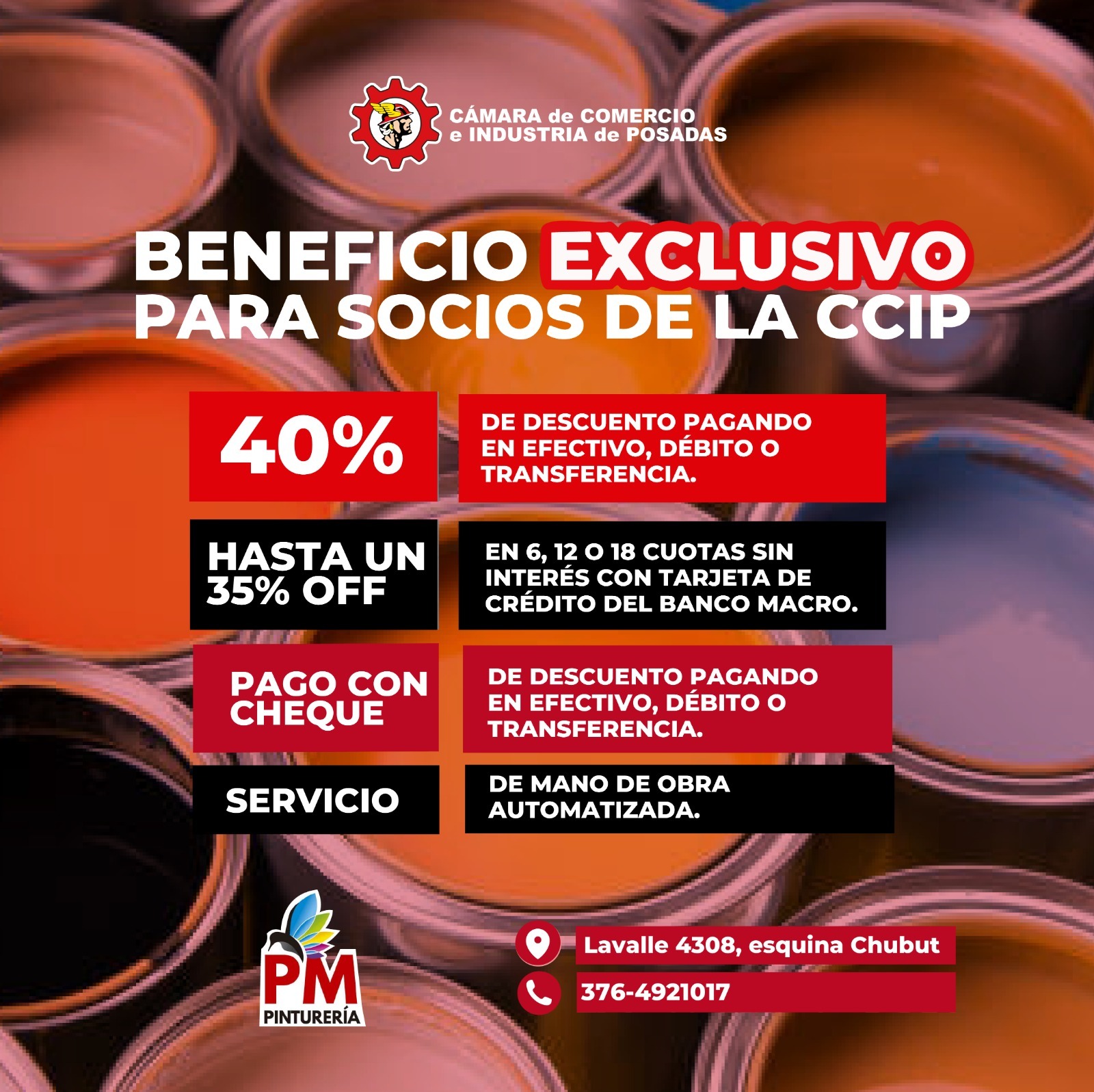 👉 Si formás parte de la Cámara de Comercio e Industria de Posadas, accedés a descuentos y facilidades únicas en PM Pinturería.